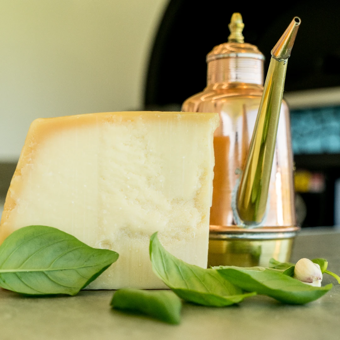 // Copeaux de Grana Padano, huile d’olive, basilic